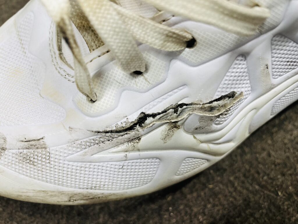 写真のように穴が開いてしまったシューズ、スパイク、運動靴を修理することが可能です。